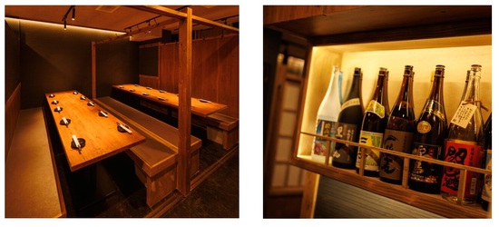 落ち着いた照明と木の温もりが心地よい扉付き個室があり、肩肘張らずにホッとくつろげる空間です。